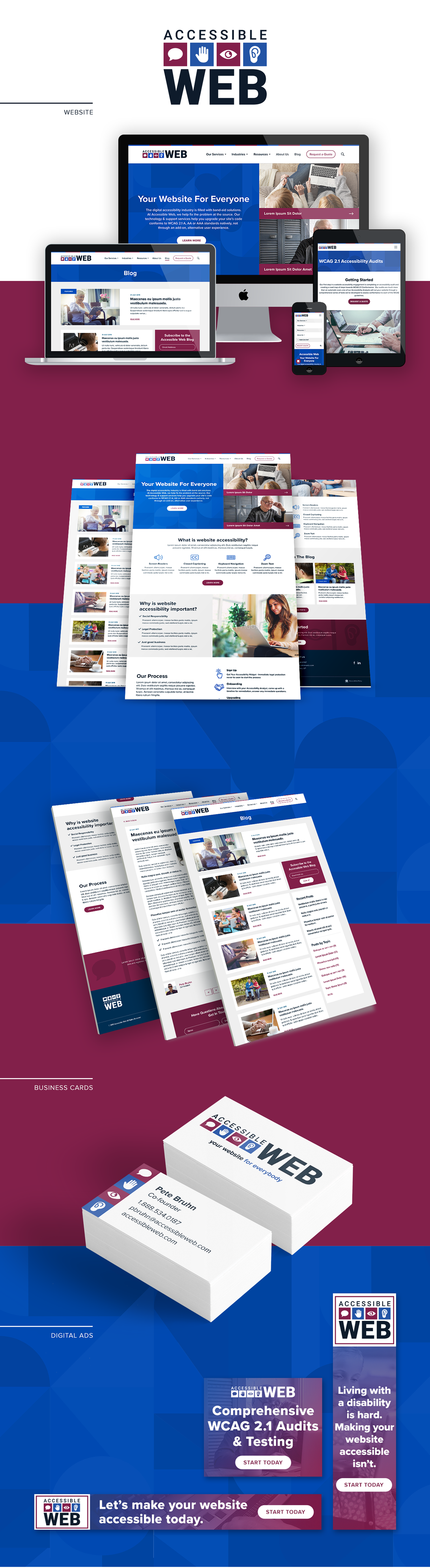 With the goal to build a web that is accessible to everyone, I teamed up with the Accessible Web team to help them revamp their logo and to develop a new comprehensive brand identity. This included designs for a new website, digital ads, business cards, trade show booth banners, and more. Working with the Accessible Web team has been an invaluable experience, learning about digital accessibility best practices and the like and informing my work to be accessible to all individuals.