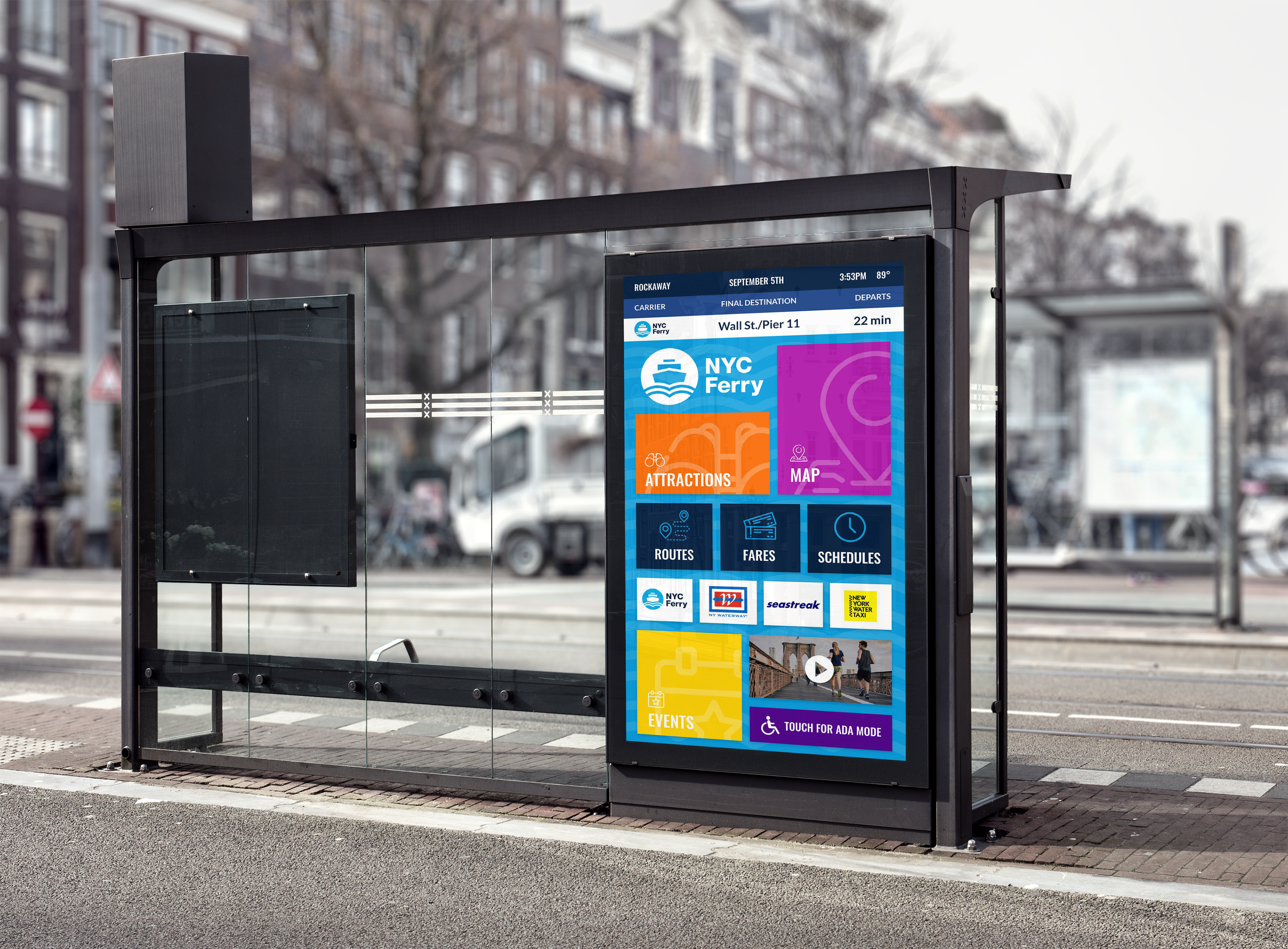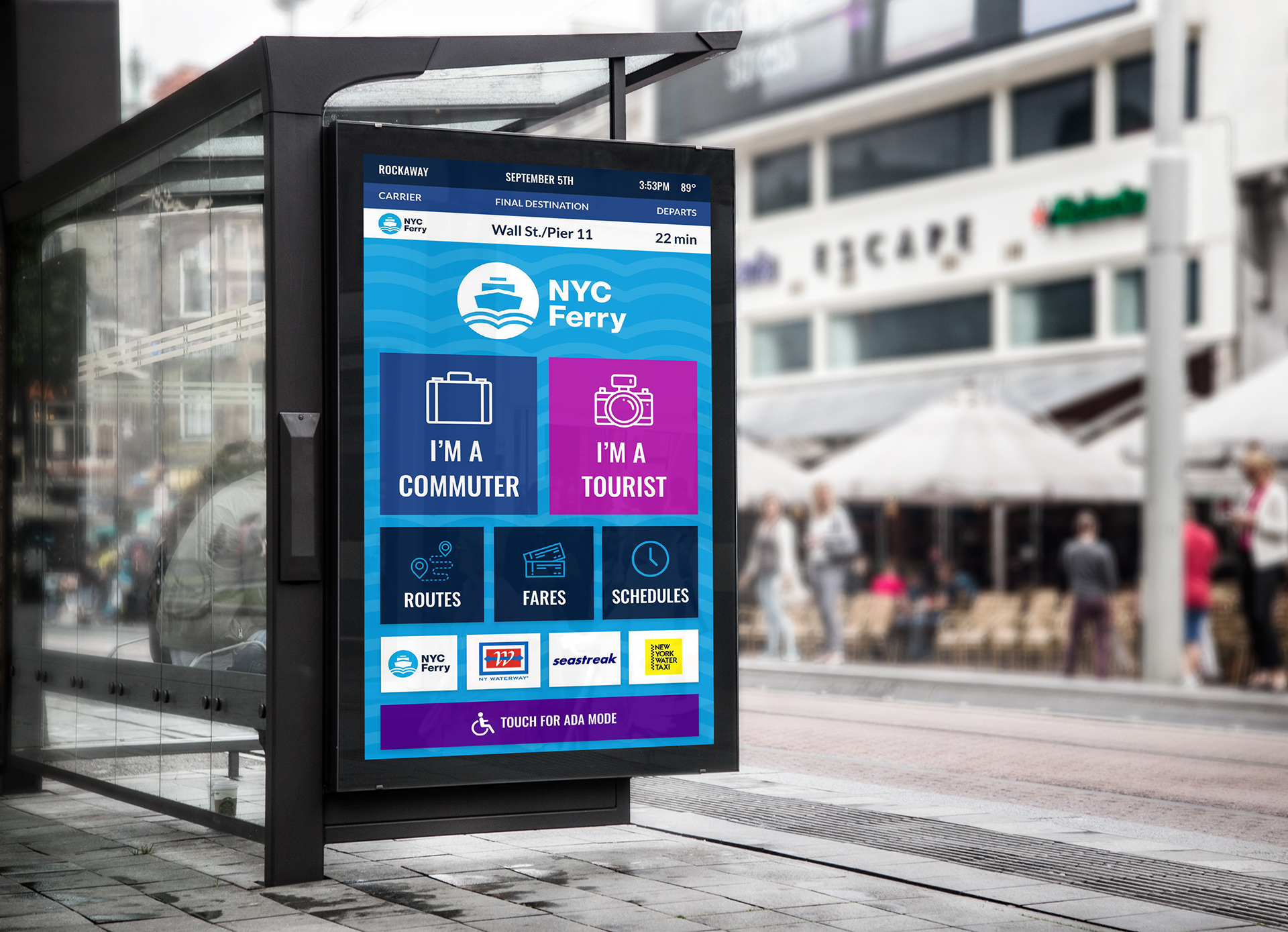 NYC Ferry was looking to re-vamp their kiosks into a more robust, styled user interface with a focused, innovative and practical user experience. Our goal was to create a guided experience for the user that was informative, interactive, and fun. The experience I developed allows users to self-select a path so the information given is more relevant to the audience. For commuters, the focus was on routes and schedules, whereas for tourists, the focus was on discovery of nearby places, attractions, and events.